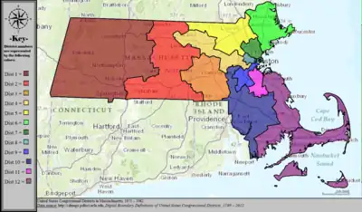 Table of United States congressional district boundary maps in the State of Massachusetts, presented chronologically.[5] All redistricting events that took place in Massachusetts between 1973 and 2013 are shown.