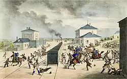 Because of its location, General Windisch-Grätz chose Běchovice as a main centre for searches for rebels.[1][2] Windischgraetz and his army searched each train, but they were not able to find any guns or rebels. Soon after 6 a.m., a train arrived full of students fleeing from Prague. It is not known what exactly happened. There was probably a minor skirmish between one of the passengers and some soldiers, but it grew to a massacre. Hussars attacked the train and slaughtered everyone on sight. Everyone was ordered to stay on the train, but the hussars pulled people out and killed them. Some of the passengers, mainly women and children, fled to the nearby train station building although it was under heavy fire.