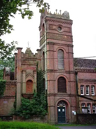 Massey's Folly, a grade II listed building,[1] was built by Thomas Hacket Massey who served as rector in Farringdon village in Hampshire for 62 years.[2] The folly took thirty years to build as it was entirely built by Massey along with a single bricklayer.[2] Further delays were due to Massey occasionally demolishing completed parts of the structure and making further additions.[2] It has seventeen bedrooms and two towers. Its purpose is unknown, but from 1925 it was used as a primary school (closed 1987) and a village hall (closed 2015).[3] Massey, who died in 1919, is buried just outside the church porch.[4]