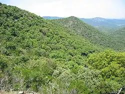 The massif is densely vegetated with an evergreen forest dominated by cork oak, holm oak, holly sweet chestnut and strawberry trees. On the highest ridges Aleppo pine and stone pine flourish.