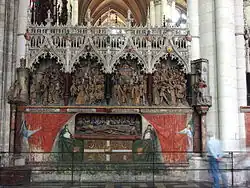 She also recognizes the master's hand in the paintings on the tomb of Ferry de Beauvoir in the choir of Amiens Cathedral, commissioned in 1489 by his nephew Adrien de Hénencourt, canon of the cathedral chapter.[50][51] All around the coffin in which the bishop's recumbent relies, angels and canons are depicted in trompe-l'œil, drawing a veil over the tomb and a representation of the coat of arms and the mystic lamb. The canon on the right recalls the figure of Saint Bernard in the Hours of Mâcon. The painting behind the recumbent bed depicts the apostles, reminiscent of those, or the Magi, from the same Hours. Some historians question this attribution.[52]
