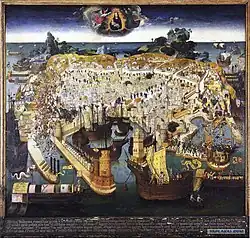 Dated 1483, this work by Guillaume Caoursin, vice-chancellor of the Order of St. John of Jerusalem, recounts the siege of Rhodes three years earlier. It is a rare example of a chronicle evoking events contemporary with its writing, a veritable work of propaganda for the Order of Chivalry, designed to convince Western sovereigns to support their fight against the Turks. The work contains 51 full-page miniatures, 32 of which illustrate the siege itself, 4 the death of Mehmed II and 11 the story of Zizim. The manuscript was destined for the Order's Grand Master, Pierre d'Aubusson, with almost every miniature depicting him.[22][23] The draft of Caoursin's manuscript, still preserved in the Vatican Apostolic Library (Reg. Lat. 1847), contains part of the illuminator's instruction book. It details every monument, every character and every costume to be depicted in the work.[24] The author also indicates that he is sending a painting of the city of Rhodes to serve as a model. Eight miniatures are topographical views of the city, four of which are general aerial views, while the other four show details of the fortifications.[25]