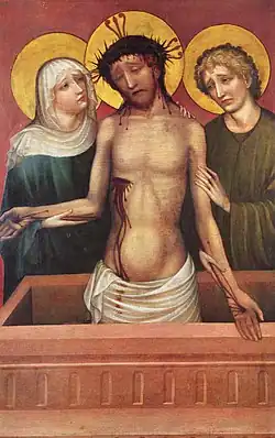 The Master collaborated with the Master of the Imhoff Altar in the creation of the eponymous altarpiece; his depiction of the Man of Sorrows with the Virgin and Saint John forms the reverse panel. This is a characteristic example of his solemn and simple style. Another, more restrained work is the Man of Sorrows Standing with the Virgin, today in the Germanisches Nationalmuseum.
