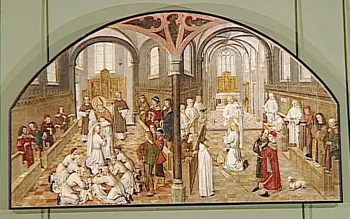 The list of donors demonstrates the importance of the monastery. The cycle was probably completed around the time of the coronation ceremonies of Maximilian as King of the Romans in 1486, and it has been speculated that the reason for the choice of canvas as a support was for ease of moving and displaying the paintings in different locations.[5] Also, this cycle constitutes the first set of paintings of such monumental dimensions produced in Cologne. It is plausible that this work inspired other cycles of saints' lives in Cologne, particularly that created by the Master of the Legend of Saint Ursula.[9]