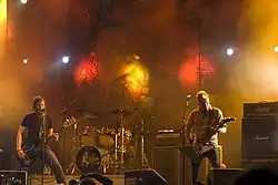 The "sludge/stoner/alternative metal outfit" Mastodon, as labeled by AllMusic, is "one of the preeminent metal acts of the early 21st century".[103] The BBC stated about Mastodon: "They might be bonkers of lyric, full of fantasy mumbo jumbo, but the band is unashamedly committed to its complex-of-composition craft, and the results have frequently stunned ever since their 2002 debut, Remission. They are the most ambitious, most fearless, most fun heavy metal band to have breached the mainstream since the genre oozed its way out of The Midlands in the 1970s."[117] Alternative Press has stated: "Mastodon are one of the all-time great hard rock groups."[118] Rolling Stone stated: "Mastodon are a bunch of doom-haunted, myth-obsessed, meat-and-potatoes Southern badasses who have become the most important new band in metal."[119] Playboy[120] wrote: "one of Mastodon's greatest talents: the ability to take traditional metal fans along with them into other musical realms, and also appeal to more mainstream rock fans but give them some doses of metal."