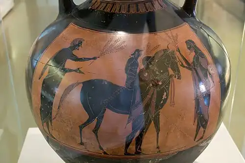The Mastos Painter also depicts a Panathenaic victory procession on what has been identified as a genuine prize amphora.[8] The scene depicts the winning horse in a race, mounted by the nude boy-jockey holding a pair of branches. An elaborately clothed man stands in front of the horse, patting its muzzle and holding a wreath and branches. He may represent the owner, who would have been considered the victor. The man who stands beside the horse, holding its bridle, is perhaps the trainer. A third well-clad man holding branches stands behind the horse.[9]