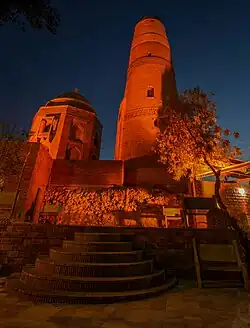 The minaret of Ali Abuzar is the most conspicuous structure of Sukkur town, dating back to 1607 during the Mughal Empire in the Indian subcontinent. Masum Shah was the governor of Mughal Emperor Akbar who appointed him as the Nawab of Sukkur. The minaret was built about 1607. The monument, built of red brick, is more or less conical in shape, slightly off the perpendicular and surmounted by a dome to which an internal stone staircase gives an access. It is about 26 metres in circumference and has 84 steps to the top. It is about 31 metres feet in height and can be seen from miles away. This minaret is believed to have been used as a watch tower. The courtyard around the minaret is the cemetery where Mir Mausum Shah and his family members are buried.