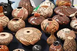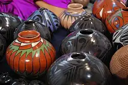 Emphasis is generally on quality rather than quantity, differing from pottery production in central Mexico.[1] Most pottery that is produced is of lesser quality with thicker walls and less-artistic painting. There is a middle group that makes good quality and an elite number who can make truly artistic wares. These top artists include members of Quezada's family (Lydia, Nicolas, Noe, and Damian Quezada), the Ortiz family (Felix, Nicolas, and Macario), Taurina Baca, and Hector and Graciella Gallegos, among others. Nicolas Ortiz is best known for creating sculptural pieces.[4] From the last category come some of the best handmade pottery in the world.[7]