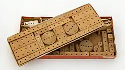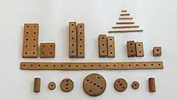 Matador is a wooden toy set. The bricks are held together using special wooden sticks.
