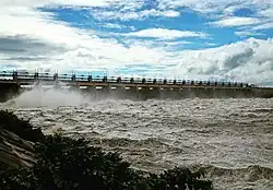 The Matatila Dam is a dam in district Lalitpur, Uttar Pradesh, India, that was built in 1958 on the Betwa River. Situated 50 km from Jhansi and 93 km away from Deogarh, this earthen dam is 35 m high. The dam has 23 Spillway gates. The catchment area is around 20 km2 with a maximum storage capacity of 1132 million cubic metres.