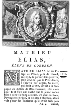 Mathieu Elias, Elyas, or Elie, was a baroque painter. He was born at Peena, near Cassel, in 1658. His parents were extremely poor, and he was employed when a boy in attending cattle, in which humble situation he was noticed by a painter of Dunkirk, named Philippe De Corbehem, tracing objects on the ground. The artist, struck with the singularity of the circumstance and the evident disposition of the boy, prevailed on his mother to entrust him to his care. After instructing him for some time he sent him to Paris for improvement, where he met with employment, and resided several years. On the death of De Corbehem, he settled at Dunkirk, and painted some altar-pieces for the churches in that town and its neighbourhood. He died at Dunkirk in 1741.