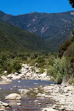 The wilderness is located about 12 miles (19 km) northwest of Ojai[3] in the Santa Ynez Mountains and spans most of the watershed of Matilija Creek, the main tributary of the Ventura River.[2] Matilija Creek (sometimes known as "Middle Matilija Creek" to distinguish it from its various forks) flows from the northwest corner of the wilderness in a southeasterly direction through a deep canyon, and is joined by several major tributaries including the Upper North Fork of Matilija Creek, Old Man Canyon, and Murrieta Canyon. A small northern portion of the wilderness is drained by Sespe Creek, a tributary of the Santa Clara River.[4]