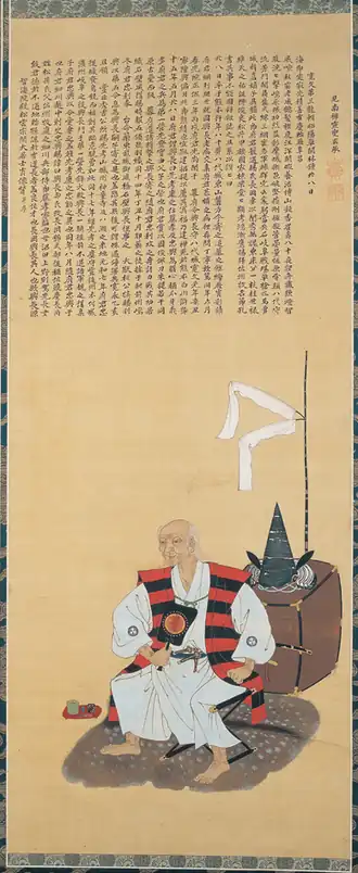Matsui Okinaga (松井 興長; 1582 – July 24, 1661) also known as Nagaoka Sado (長岡 佐渡) was a Japanese samurai who served the Hosokawa clan, during the early Edo period (17th century). It was Nagaoka Sado himself who had protected Miyamoto Musashi as for him to be able to duel against the famous Sasaki Kojirō in 1612. At one time during the year of 1638, Musashi had met Sado. Sado had known at the time that Musashi was living in the house of Ogasawara, but he had learned that it was Musashi's son, Miyamoto Iori who had been under the service of the Ogasawara, and that Musashi was there as a guest. Sado had also learned that Musashi had no true intention of entering under the lord's service, and that he was only taking part in that battle (Ogasawara establishment in northern Kyūshū) as a staff in order to be an advisor to his son. After Sado had then returned to the province of Higo, he began planning the steps to get Musashi into the service of his fief, since he had already known that Lord Hosokawa Tadatoshi was interested in him. However, Tadatoshi had been previously schooled in the wisdom of the feudal system, in which he ordered for Musashi to act prudently, because Musashi's current situation as he had known, was residing within the house of Ogasawara, in relation to the fact that it would be a major mistake to show discourtesy.