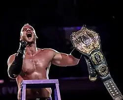 At Death Before Dishonor XVI, The Kingdom attacked Will Ospreay and Jay Lethal. After the assault, Taven pulled out of a bag a copy of the Ring Of Honor World Championship which was purple instead of black leather, saying he is the true Ring Of Honor World Champion.[38] On November 2, 2018, The Kingdom would win the ROH World Six-Man Tag Team Championship for the third time, beating The Elite,[39] holding them until March 16, 2019. On March 15, 2019, at the ROH 17th Anniversary Show, Taven challenge Lethal for the Ring of Honor World Championship, with the match ending in a 60-minute time-limit draw.[40] The following month at G1 Supercard, Taven would defeat Lethal and Marty Scurll in a ladder match to win the ROH World Title, and with that becoming the second ROH Grand Slam winner.[41][42] His title win over the more popular Marty Scurll has been criticized,[43][44] usually calling him a "critical and financial flop".[45] During a 411Mania podcast, Jerome Cusson said his title win "actively hurt ROH" since it was not "a draw" and he "wasn't over".[46] On September 27, 2019, at Death Before Dishonor, Matt Taven was defeated by Rush for the ROH Championship, ending his reign at 174 days.[47] On ROH television Vinny Marseglia turned and attacked Matt Taven.[48][49] On December 13, 2019, at Final Battle, Marseglia defeated Taven.[50]