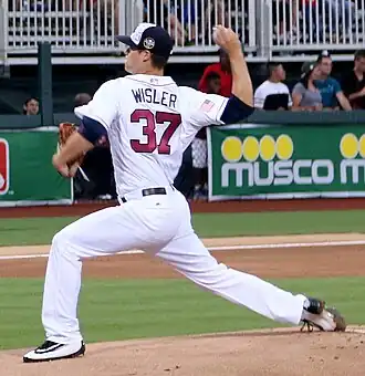 Wisler began the 2016 season third in the Braves starting rotation,[16] making his season debut on April 8 against the Cardinals.[17] On April 17, Wisler recorded his first major league save, helping the Braves secure a sweep of the Miami Marlins.[18] He pitched effectively as a starter until May, recording a 3.16 ERA in ten starts.[19] In his following ten starts, Wisler pitched to a 7.71 ERA and allowed 16 home runs. His batting average against also rose, and as a result, the Braves demoted Wisler to Gwinnett on July 28.[20] The team announced on August 24 that Wisler would be recalled the next day to start against the Marlins.[21] He pitched well against the Arizona Diamondbacks and San Diego Padres, and left the latter start with a strained oblique. In 2016, at Triple-A Gwinnett he was 2–1 with a 3.71 ERA, and in the major leagues he was 7–13 in 27 games (26 starts) with a 5.00 ERA (giving up 26 home runs in 156.2 innings).[15][22] In the offseason, Wisler pitched two games in the Dominican Winter League for Tigres del Licey.[23]
