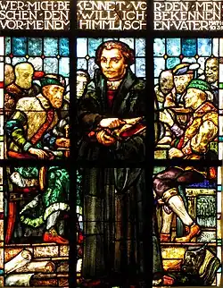 "Luther et la Diète de Worms en 1521" with Matthew 10:32 in German, on the window of Église protestante de Notre Seigneur Jésus-Christ de Bischheim, Alsace, Bas-Rhin. Joseph Ehrismann (1880-1937). | |