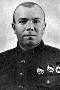 In 1918 he joined the Red Army, and during the Civil War served with enough distinction to be awarded both the Order of the Red Banner and the Order of the Red Star.[1] During the interwar years he commanded the 63rd Cavalry Regiment for more than two years in 1933-35, then was transferred to serve two years as the assistant commanding officer of the prestigious Special Cavalry Division named for I.V. Stalin. He went on to the position of acting commander of that division for the following year. In 1938 he spent three months as Inspector of Cavalry for the Far Eastern Separate Red Banner Army, during which time he was promoted to the rank of Kombrig. He went on to take command of the 31st Cavalry Division for over a year. From December, 1939, until the outbreak of the Great Patriotic War he attended the Military Academy of the General Staff. On June 4, 1940, he was promoted to the rank of major general.[2]