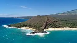 Maui's last eruption (originating in Haleakalā's Southwest Rift Zone) likely occurred between 1480 and 1600;[13] the resulting lava flows are located at Cape Kīnaʻu between ʻĀhihi Bay and La Perouse Bay. Haleakalā is dormant, but not extinct.[14]