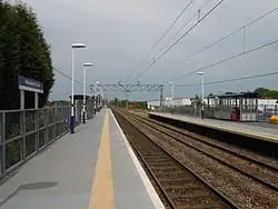 As part of a £12 million station modernisation programme on the Manchester Airport Line, rebuilding work on Mauldeth Road station commenced in autumn 2006.[4] Network Rail were able to keep the station operational for most of the time by demolishing the existing platforms in small parts and using temporary platforms. There was a temporary footbridge spanning the platforms while the pedestrians' access ramp to the northbound platform was out of use during renovation; the footbridge offered a vantage point for views over Manchester.[5] As part of the rebuilding work, new steel platforms, modern waiting shelters, new lighting and access ramps were constructed; the work was completed by June 2007.[6]