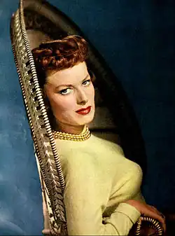 O'Hara was offered roles in The Razor's Edge (1946), which went to Tierney, John Wayne's film Tycoon (1947), which went to Laraine Day,[94] and Bob Hope's The Paleface, which went to Jane Russell. She turned down the role in The Paleface as she was going through a turbulent period in her personal life and "didn't think I would be able to laugh every day and have fun". She later deeply regretted turning it down and confessed that she'd made a "terrible mistake".[95] In 1947, O'Hara starred opposite Douglas Fairbanks Jr. as Shireen in the adventure film Sinbad the Sailor. O'Hara plays a glamorous adventuress who assists Sinbad (Fairbanks) locate the hidden treasure of Alexander the Great. She found the scenario to be "ridiculous", but stated that it made a "pot of money for RKO—action-adventures almost always did".[96] Malone wrote: "O'Hara looks splendid and gets to wear some of the most stunning costumes of her career—a different one in almost every scene—but her dialogue is floridly empty. She exudes potential in early scenes, where her air of sybaritic slyness seems promise she'll be something more than window dressing", but thought the film "totally lacked drama". The critic from The New York Times thought that O'Hara excessive costume changes made watching her an "exhausting" experience".[97]