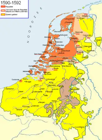 Maurice's 1591 campaign was a major campaign during the Eighty Years' War, during the campaign Maurice of Nassau was able to recapture the cities of Nijmegen, Deventer, Zutphen, Delfzijl, Hulst and Knodsenburg.[2]