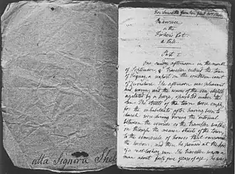 The manuscript was lost until Cristina Dazzi discovered it in the summer of 1997 in the home of the Dazzi family, Casa Cini, in San Marcello Pistoiese.[14] She was looking through a box of old papers, searching for "something interesting" to add to an exhibit about the winter of 1827–28 when the poet Giacomo Leopardi had visited and met Lady Mountcashell and her daughter.[15] Excerpts were first published in an Italian book about Lady Mountcashell by Mario Curreli in 1997.[16] One year later, Percy Shelley and Mary Wollstonecraft biographer Claire Tomalin published the entire story, along with a lengthy introduction and a typescript of the manuscript.