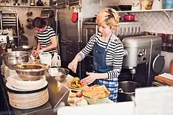 The bakery and restaurant Maurice has been described as a "French-Scandinavian" and "French-Nordic" luncheonette.[1][2] The menu includes goat-filled bisteeya (meat pies) and polenta clafouti with confit chicken heart. Dessert options include black pepper cheesecake, creme brulee pops, and rhubarb and celery leaf cheese.[3]