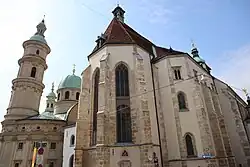 The design combines elements of late Renaissance Mannerism and early Baroque architecture. The façades display characteristics typical of the Mannerist style, including layered gables, rusticated columns, and allegorical sculptures, arranged within a confined urban setting.[1][2] One modern study describes it as "the largest and most impressive Habsburg mausoleum" and notes that it was "built in the mannerist style" that bridges the Renaissance and Baroque periods.[2] The architect drew direct inspiration from Italian models, for example, the entrance façade resembles the Jesuit mother church Il Gesù in Rome, featuring a tall triangular pediment framed by segmental pediments.[1] The burial chapel features an oval dome, which was the first of its kind to be constructed outside of Italy.[3] The overall effect is characterized by a strong massing with dramatic Baroque accents. The horizontal façades are adorned with pilasters and sculptural details, while the soaring domes and lanterns, topped with the imperial eagle, cross, and sceptre, symbolize Habsburg power. The façade of the attached St. Catherine’s Church similarly combines Renaissance and Baroque motifs typical of 17th century Austria.[1][3]