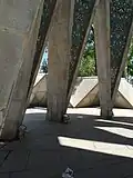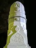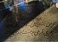 The reconstruction of the mausoleum was commissioned by the Iranian government under Reza Shah in 1934 during Ferdowsi's millenary.[4] Omar's tomb was separated from the shrine, and a white marble monument, designed by Hooshang Seyhoun, was erected over it. The construction was completed in 1963. Seyhoun combined Khayyam's talents as a poet, mathematician, and astronomer in his design.[6] Nizami Aruzi mentioned Khayyam's desire for a grave adorned with blossoms each spring. Seyhoun fulfilled this wish by creating a pathway from the garden to Khayyam's tomb, allowing flowers to fall on it annually. He also paid homage to Khayyam's geometric work with a star-shaped feature on the tomb, opening to the sky above Nishapur and symbolizing the celestial expanse.[6] To further honour Khayyam, Seyhoun decorated the structure with tiles inscribed with Khayyam poems in beautiful calligraphy, featuring Morteza Abdolrasul's abstract Shekaste Nastalik. This project aimed to modernize Iranian architecture while still embracing its heritage, marking a distinct Iranian modernism.[6]