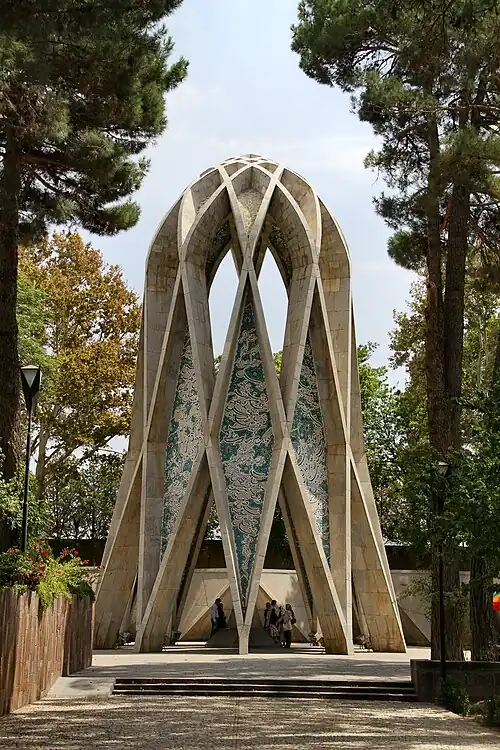 The Mausoleum of Omar Khayyám (Persian: آرامگاه عمر خیام; Arabic: ضريح عمر الخيام) is a mausoleum of white marble erected over Omar Khayyám's headstone, located on the south-east of the city of Nishapur, in the northeastern province of Razavi Khorasan, Iran. The mausoleum is a symbol of contemporary Iranian architecture. Commissioned by Reza Shah, designed by Hooshang Seyhoun, and completed in 1963, during the Pahlavi era, the structure was added to the Iran National Heritage List on 9 December 1975, administered by the Cultural Heritage, Handicrafts and Tourism Organization of Iran.