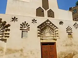 The Mausoleum of Shajar al-Durr contains 3 entrances. The qibla wall of the mausoleum contains no exterior doors but it protrudes outward to indicate its significance.[7] Ornamentation on the outside contains several stucco keel-arch niches with scalloped edges, hoods, and fluted lozenges. Above each entrance on the interior, additional keel-arch niches are bordered by two smaller rows of shallower niches with floral motifs, creating a stalactite effect referred to as muqarnas. On the interior walls of the mausoleum, unfinished blue and green foliage and arabesque designs were discovered after a recent renovation and can be seen on the stucco squinches supporting the dome above.[5]