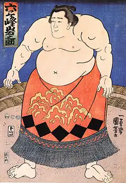 If a wrestler's mawashi comes off during a tournament bout, he is automatically disqualified.[3] This is extremely rare, but did occur in May 2000, when sandanme wrestler Asanokiri's mawashi came off during a match with Chiyohakuhō.[4] However, for most of sumo's history, whether or not a wrestler's mawashi came off during a bout was considered irrelevant, and the policy of disqualification only came into place when Japan began adopting European attitudes towards nudity.[4]