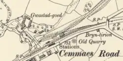 About 600 yards before Dinas Mawddwy station, the railway passed "Quarry cottages" at Maes-y-camlan. Here there was a junction, with the main line heading north-west to Dinas Mawddwy and a short branch heading due north to the main mill of the Minllyn slate quarry. A long incline carried the 2 ft 2 in (660 mm) gauge tramway down from the quarry to the mill.[24]