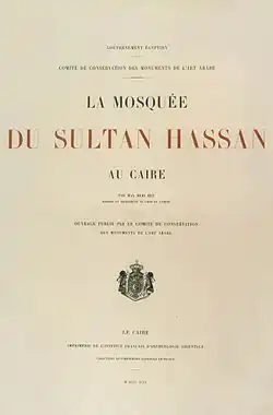 - ^ Philipp Speiser: Die Geschichte der Erhaltung arabischer Baudenkmäler in Ägypten. (Abhandlungen des Deutschen Archäologischen Instituts Kairo, Islamische Reihe, 8). Heidelberger Orientverlag, Heidelberg, 2001, pp. 68–70. ISBN 3-927552-27-5.