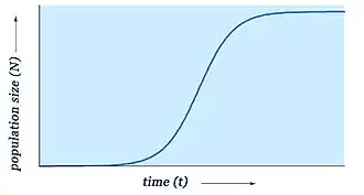 can be understood as the change in population (N) with respect to a change in time (t). Equation 1.2 is the usual way in which logistic growth is represented mathematically and has several important features. First, at very low population sizes, the value of is small, so the population growth rate is approximately equal to , meaning the population is growing exponentially at a rate r (the intrinsic rate of population increase). Despite this, the population growth rate is very low (low values on the y-axis of figure 2) because, even though each individual is reproducing at a high rate, there are few reproducing individuals present. Conversely, when the population is large the value of approaches 1 effectively reducing the terms inside the brackets of equation 1.2 to zero. The effect is that the population growth rate is again very low, because either each individual is hardly reproducing or mortality rates are high.[12] As a result of these two extremes, the population growth rate is maximum at an intermediate population or half the carrying capacity ().