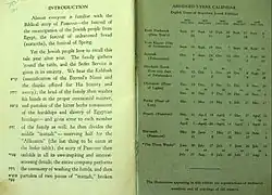 The 1932 edition gave equal prominence to the complete Hebrew text and its English translation, placing them in parallel columns, and conveyed authenticity and adherence to tradition by opening from right to left in the manner of a Hebrew book.[9] Instructions for conducting the Seder appeared on the English side only and references to biblical verses cited in the text were on the Hebrew side.[10] The Haggadah presents only the text and directions for conducting the Seder, without exegesis.[11]