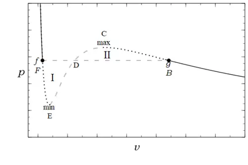 Figure 1 shows an isotherm drawn, for , as a continuously differentiable solid black, dotted black, and dashed gray curve. The decreasing part of the curve to the right of point C in Fig. 1 describes a gas, while the decreasing part to the left of point E describes a liquid. These two parts are separated by a region between the local minimum and local maximum on the curve with positive slope that violates the stability criterion. This mathematical criterion expresses a physical condition which Epstein[4] described as follows: "It is obvious that this middle part, dotted in our curves [dashed in Fig.1 here], can have no physical reality. In fact, let us imagine the fluid in a state corresponding to this part of the curve contained in a heat conducting vertical cylinder whose top is formed by a piston. The piston can slide up and down in the cylinder, and we put on it a load exactly balancing the pressure of the gas. If we take a little weight off the piston, there will no longer be equilibrium and it will begin to move upward. However, as it moves the volume of the gas increases and with it its pressure. The resultant force on the piston gets larger, retaining its upward direction. The piston will, therefore, continue to move and the gas to expand until it reaches the state represented by the maximum of the isotherm. Vice versa, if we add ever so little to the load of the balanced piston, the gas will collapse to the state corresponding to the minimum of the isotherm."