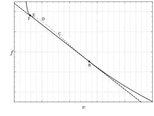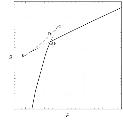 A plot of this function for the same subcritical isotherm of the vdW equation as Figs. 1 and 2 is shown in Fig. 3. Included in this figure is the (dashed/solid) straight line that has a double (common) tangent with the curve of the function at B and F. This straight line is, , with constant, which can be written as . The last equality follows from the relation ,[29] together with .[18] All this means that every point on the line has the same values of , in particular the points B and F, which produces the Gibbs condition for material equilibrium as well as equality of temperature and pressure.[30] Therefore this construction is equivalent to both the Gibbs conditions and the Maxwell construction.