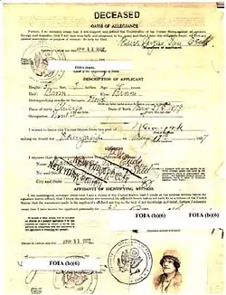 The Baroness died in New York City on March 10, 1937.[4] Her death certificate identified her as May de Pallandt van Eerde[4] and the cause of death was noted as cancer. The newspaper death notice listed her as beloved wife Marie of Edward Allen Morrisey, who worked for the Zanuck Movie Company.[4]