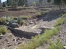 Runoff mostly happens in the form of high runoff discharge events that occur in a very short period (called flash floods). These are related to the steep topography, often little vegetation cover and intense convective rainfall. The peaks of such flash floods have often a 50 to 100 times larger discharge than the preceding baseflow.[2] The magnitude of floods in this river has somewhat been decreased due to interventions in the catchment. On some steep slopes, exclosures have been established; the dense vegetation largely contributes to enhanced infiltration, less flooding and better baseflow.[3] Physical conservation structures such as stone bunds[4][5] and check dams also intercept runoff.[6][7]