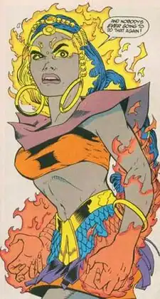 ![]() Maya as depicted in Justice League International (vol. 2) #64 (May 1994). Art by Chuck Wojtkiewicz (penciler), Craig Gilmore (inker), Gene D'Angelo (colorist), and Clem Robins (letterer). | |