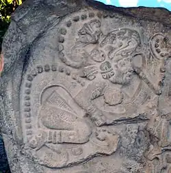 The Jaguar God of Terrestrial Fire is recognizable by a 'cruller' around the eyes (making a loop over the nose), jaguar ears, and fangs. He personifies the number seven, which is associated with the day Akʼbʼal ('Night'). Usually called 'Jaguar God of the Underworld', he has been assumed to be the 'Night Sun' - the shape supposedly taken by the sun (Kinich Ahau) during his nightly journey through the underworld - by reason of having the large eyes and filed incisors that also occur with the sun deity, and of sometimes evincing a k 'in infix. The deity's hypothetical aspect of a nocturnal sun (that is, a subterranean fire) should perhaps be connected to his proven association with terrestrial fire. He is often represented on incense burners and connected to fire rituals,[4] while his 'cruller' may represent a cord used in making fire with a stick (Taube). Moreover, vases in codical style show him, captured, about to be burnt with torches. The nocturnal sun hypothesis is complicated by this very incident, and even more so by the fact that the fiery jaguar deity is identified with a star (or perhaps a constellation or planet).[5] The god's other sphere of influence is war, witness for example the stereotypical presence of his face on war banner.
