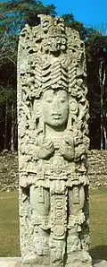 The iconography of stelae remained reasonably stable during the Classic Period, since the effectiveness of the propaganda message of the monument relied upon its symbolism being clearly recognisable to the viewer.[11] However, at times a shift in the sociopolitical climate induced a change in iconography.[32] Stelae were an ideal format for public propaganda since, unlike earlier architectural sculpture, they were personalised to a specific king, could be arranged in public spaces and were portable, allowing them to be moved and reset in a new location. An important feature of stelae was that they were able to survive different phases of architectural construction, unlike architectural sculpture itself.[33] With the ability to portray an identifiable ruler bearing elite goods, accompanied by hieroglyphic text and carrying out actions in service of the kingdom, stelae became one of the most effective ways of delivering public propaganda in the Maya lowlands.[34] In 7th-century Copán, king Chan Imix Kʼawiil raised a series of seven stelae that marked the boundary of the most fertile land in the Copán valley, an area of approximately 25 to 30 square kilometres (9.7 to 11.6 sq mi).[35] As well as marking the boundary, they defined the sacred geometry of the city and referred to important seats of deities in the ceremonial centre of the Copán.[36]