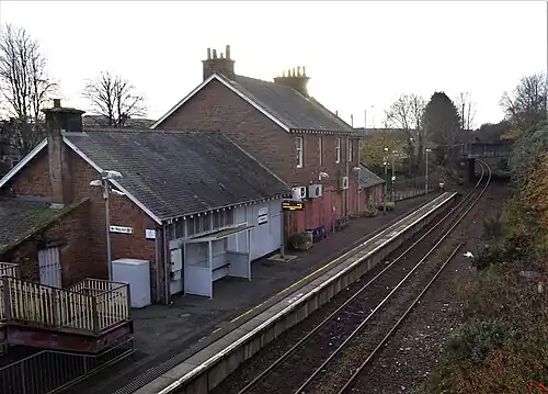 The station was originally a two side platform station rebuilt in 1880,[2] with the two-storey main offices on the down platform, and a large single-storey building with glazed awning on the up platform.[2] When the line was singled in 1973 the northbound platform was removed and the building demolished. The down platform and main building remain, part of which is a local convenience store and part used by Network Rail.