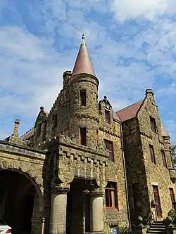 Designed by renowned Philadelphia architects George Watson Hewitt and William D. Hewitt,[2] the house was purportedly meant to look like a Medieval Norman castle in Scotland. Gibson imported English stonemasons to construct the 35-room mansion that has a gross area of 20,000 square feet with a 72-foot tower. It was finished in 1881 but had later additions added by Henry Gibson's daughter who inherited the property after his death including a library and a ballroom.[3]
