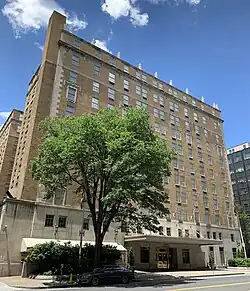 The Mayflower Hotel was built by Allan E. Walker, the land developer behind Brookland and other residential neighborhoods of Washington.[11] Initially called the Hotel Walker, it was to have 11 stories, 1,100 rooms, and cost $6.2 million ($116,468,787 in 2024 dollars).[12] On May 27, 1922, the Walker Hotel Company was organized, with Allan Walker as president. The corporation issued 80,000 shares of preferred stock worth $2 million and 80,000 shares of common stock, and purchased a site on the north half of the block on DeSales Street between 17th Street and Connecticut Avenue. Plans for the hotel, whose cost was now pegged at $6.75 million ($126,800,696 in 2024 dollars), now included an 11-story, 1,100-room hotel facing Connecticut Avenue, whose first two floors would be common rooms, and an eight-story residential hotel facing 17th Street. Robert F. Beresford of Washington, D.C., and the New York City architectural firm of Warren and Wetmore were appointed the architects, and Beresford said the structure would be built of concrete and brick around a steel frame. Indiana limestone would be used for the facade on the first three floors, with rusticated brick and terra cotta trim on all upper floors.[13] By June 6, however, the cost of the hotel had risen to $8 million ($143,438,330 in 2024 dollars),[14][11] largely due to a sizeable expansion in the size of the ballrooms (the largest of which could now seat 1,600 people),[15] meeting rooms, and other public spaces on the first two floors and first basement level.[14]