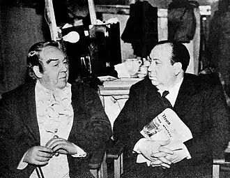 Mayflower Pictures' third movie was based on Daphne du Maurier's 1936 novel, Jamaica Inn, and was first adapted for the screen by Sir Hugh Walpole.[24] Laughton personally invested the majority of his life savings in the production.[62] In May 1938, Alfred Hitchcock signed on to direct the picture, but would only begin work on it after returning from his first trip to America in June 1938.[63] Hitchcock brought in a new team of writers to work on the script, including Sidney Gilliat, Joan Harrison, J. B. Priestley, and his wife Alma Reville. The movie was set and partly filmed in Cornwall,[63][64] though most of the shooting took place at Elstree Studios, where the weather did not hinder the production.[65][66]