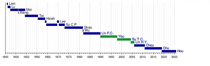 - ^ Left office to serve as Taiwan Province Civil Affairs Department Commissioner.