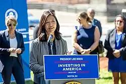 Wu was elected mayor in 2021.[5] Her election made her the first woman, first person of color, and first Asian American elected to serve as the mayor of Boston.[2][3] At 36 years of age, was also the youngest individual elected to the office in nearly a century. Wu is a member of the Democratic Party.[4]