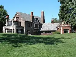 The service complex was designed by Howard Van Doren Shaw including servants' quarters, horse stables, garages, workshops, and a greenhouse, but these service buildings have since been razed.[7]